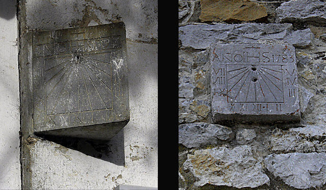 Reloj de sol del Palacio de los Yano (izquierda) y de la iglesia de San Pedro (derecha)